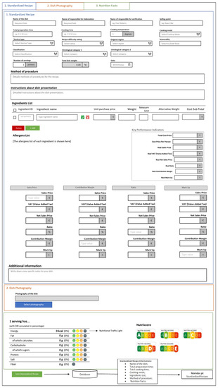 The development of standardized recipes (SR) or cost control sheets for standardized recipes is not a recent topic. The standardized recipe has essential roles: (1) in the parameterization of the quality and quantity of products to be used in a recipe; (2) in key performance indicators (KPIs) management; (3) and is essential for the calculation of the nutrition facts and allergen information of a recipe [1].