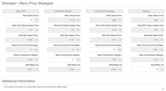 The Decreto-Lei No. 138/90 requires that all sales prices (SP) must include all fees and be expressed in Portuguese currency so that the customer is aware of the exact value he must pay for the product [29]. The rates applied for restaurants assume the value of the value-added tax, commonly referred as VAT. In Mainland Portugal, three VAT rates can currently be applied, and only two are used in restaurants. The 13% VAT rate is generally charged in food services and still water. A rate of 23% is applied to all beverages except still water [30].