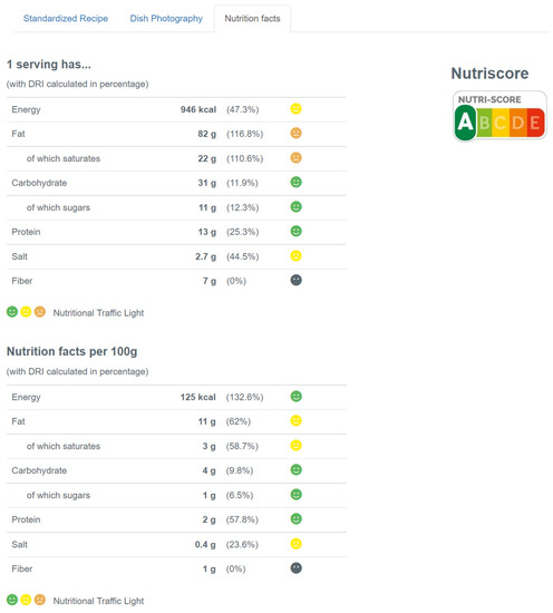 The Office of the Surgeon General et al. [43] suggested that nutrition facts should be available on the dishes, and DiPietro et al. [44] conclude that healthy foods are on the rise on restaurant menus. According to Davis et al. [9], Jeffrey [18], Patil and Pol [21], and the Centre for Tourism Studies (CESTUR) [11], nutrition facts can be included in the SR. Through the SR, it is possible to check nutritional values, quantities of the recipe, and the quality of the products [21]. The calculation of nutrition facts per 100 g is also achievable [28].