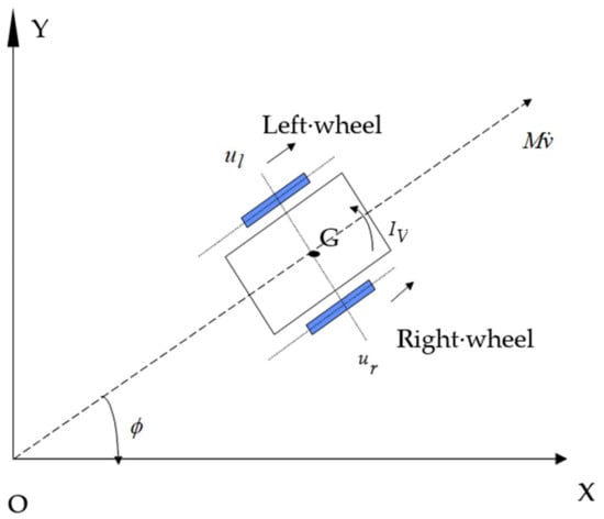 When considering a mobile service robot model, a mathematical model can be set as shown in Figure 3. The state spaces of the dynamic equations are described as below []: