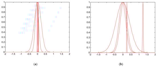 where , and are compact sets of reasonable bounds on , , and , respectively, and they are defined as , , and , where , , and are positive constants. In order to improve the accuracy of the weightings calculation, Equations (9)–(11) are used to adjust , and , which have larger variation ranges that are used to cope with the input signals but are unable to guarantee that , , and . Therefore, these parameters are tuned according to the projection algorithm []. Finally, the parameters will be bounded in the compact sets. The adaptive laws are derived as follows