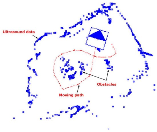 The experimental robot is composed of two driving wheels, one auxiliary wheel, a DC motor, a control system, a driving system, a decoder, and software. The control board consists of a CPU with a computing speed of 150 MHz, 32 bits, and 32 K RAM. There are 11 ultrasonic sensors around to read the surrounding data. In addition, a notebook computer is used to connect to the control board via USB, process control signals, and issue commands to control the motors. Using this robot control panel and control system, signal observation and analysis for many robot controls, including position, velocity, and acceleration control, can be easily accomplished. Using sensor information and control system software, and by connecting with a laptop, many intelligent high-end robots controls can be completed, such as obstacle avoidance and path planning. In this paper, the practical test environment is set up as Figure 7. Two barriers were set up for testing. After reading the image and ultrasound sensor data, the robot can be controlled by the SGAFNN controller. The result of the motion trajectory is shown in Figure 8.