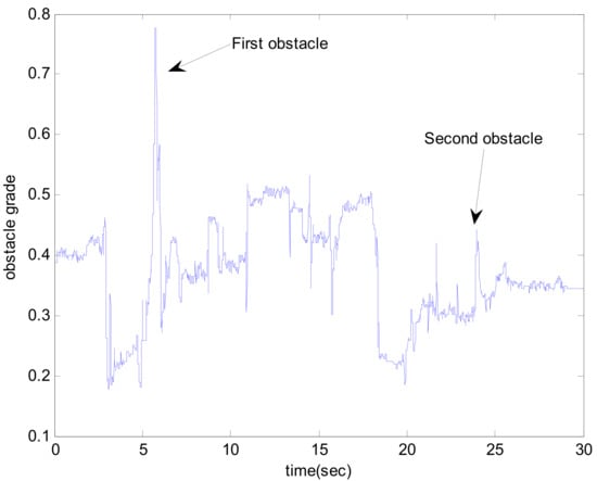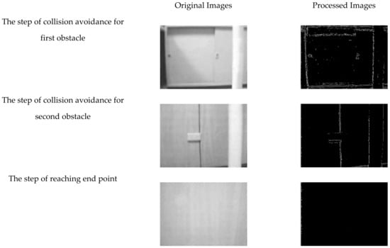 This shows that the wall and obstacles can be avoided. Regarding the image processing, results are shown in Figure 9 and Figure 10. The commonly used image edge detection technique is utilized to identify the obstacle grade signal; if it exists, the peak signal will be generatedto slow down the robot speed. Meanwhile, by using ultrasound sensors a desired path can be generated. Finally, the SGAFNN cooperates with these data to control the robot to follow this desired path. The experiment shows that the proposed SGAFNN possesses good performance in terms of velocity and turning angle control so as to avoid collision with walls and obstacles in the real test environment.
