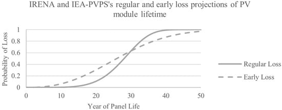 Figure 1 plots the Weibull functions for IRENA and IEA-PVPS’s regular and early loss scenarios using the scale and shape parameters defined above, and