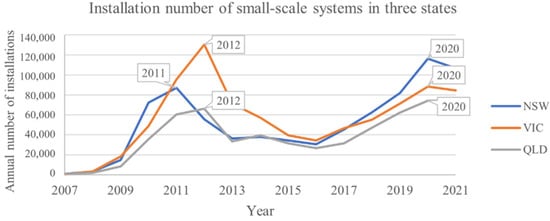 30]. Then the second peak in 2020 occurred when NSW, Queensland (QLD), and Victoria (VIC) introduced their first state-led rebates and interest-free loan schemes [