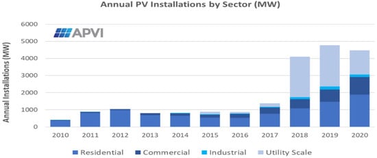 - Australian PV Institute (APVI). 2020 PV in Australia Report. 2020. Available online: https://iea-pvps.org/national-survey-reports/?year_p=&country=47&order=DESC&keyword= (accessed on 30 September 2021).