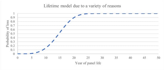 16]. That 2016 report provided the first global projections for future PV panel waste volumes to 2050. In estimating the volume of future PV waste, IRENA and IEA-PVPS projected a regular loss scenario based on an average panel lifetime of 28 years, and an early loss scenario that considers ‘infant’, ‘mid-life’, and ‘wear-out’ failures shortening the average lifetime to 26 years. The Weibull function describes the probability (%) of module decommission during the panel life cycle. Both the regular loss and early loss scenarios were modelled with a Weibull distribution as shown in Equation (1),