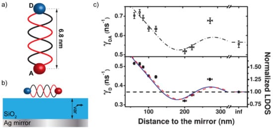 The LDOS appearing in the formulation of the Fermi golden rule can be tailored by structuring the electromagnetic environment in which the fluorophore is immerged. The existence of cavity resonances or plasmonic modes in the surrounding can, therefore, play a substantial role in the modification of the spontaneous emission decay rate and, as a consequence, in the possible dipole–dipole interaction with neighboring molecules [13,14,15]. A seminal work by Chance et al., investigated the dependence of the FRET rate and efficiency on the distance between a donor/acceptor pair (DAP) and a metallic mirror [6]. The metallic mirror is, perhaps, the simplest way to structure the LDOS around a DAP by changing the distance between them. In such a configuration, an oscillation of the emission rate of the DAP was reported as a function of the distance with the mirror, in accordance with the oscillations of the LDOS. Chance et al. concluded that, while the FRET efficiency is influenced by the LDOS configuration, the FRET rate is not [6]. Blum et al. confirmed these findings 34 years later by setting up an experimental procedure that became de facto a benchmark in these kinds of investigations [7]. In particular, they used a DAP constituted by two fluorophores, Atto488 (donor) and Atto565 (acceptor), separated by 15-base-pairs DNA strands, used as a 6.8 nm spacer between the two fluorophores (see Figure 1a). Then, they placed the DAP on top of a SiO2 film used as a variable-thickness spacer between the DAP and a thick Ag mirror (see Figure 1b). Their measurements confirmed the oscillations found by Chance et al. in the emission rate of the DAP as a function of the thickness of the SiO2 layer (see Figure 1c).