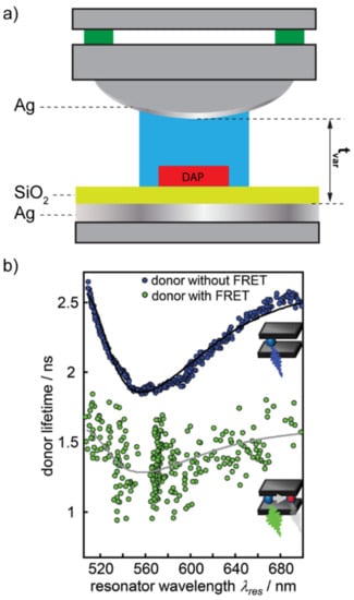 Fabry–Pérot cavities are exceptional for structuring the LDOS around a fluorophore. These resonators are, indeed, a standard in Cavity-Quantum Electro-Dynamics (C-QED) studies and, in particular, in those related to the so-called “Purcell effect”. The Purcell effect is a phenomenon according to which the decay rate of an emitter is enhanced by a resonant electromagnetic environment in tune with the radiative optical transitions of the emitting molecule [17]. Purcell effect originates from the increase in LDOS introduced in the proximity of the emitter by a resonant cavity and describes how the probability of such a fluorophore to spontaneously decay through radiative processes can be enhanced by a factor f = 3Qλ3/(4π2V), where Q is the quality factor of the resonant cavity, λ is the wavelength associated to the active optical transition and V is a quantity called “modal volume [18]. The capability of the Purcell effect to enhance the photoluminescence of a single fluorophore can do the same in the FRET mechanism, provided that a suitably high Q-factor resonance is used. Konrad et al. recently demonstrated this by means of a tunable Fabry–Pérot cavity [19]. In their work, the authors consider a FRET pair constituted by two dyes of the same family (Atto488 as a donor and Atto590 as an acceptor), linked to a DNA strand, similar to the case of Figure 1a. The decay lifetimes of the FRET pair have been measured both in the pristine configuration (stand-alone FRET pair) and by placing them inside a tunable Fabry–Pérot microcavity, directly built over a confocal microscope (Purcell-effect-assisted FRET) (Figure 2a). As expected, the static photoluminescence spectrum of the Purcell-effect-assisted FRET pair was substantially modified by the optical response of the cavity, as reported in other works [13]. However, no exceptional modification of the decay lifetimes of the FRET pair was detected in the presence of the Purcell effect (Figure 2b).