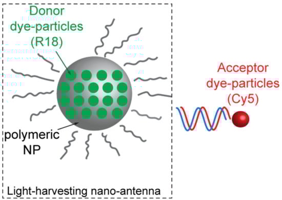 Loading polymeric NPs with a large number of donor molecules revealed such a proficient technique also for bio-sensing applications and with no strict necessity to leverage on high-Q-factor resonances. Melnychuk et al., for example, demonstrated a 2000-fold enhancement of FRET efficiency through a very peculiar technique based on the so-called light-harvesting nano-antennas [26]. These structures are constituted by 40 nm PMMA nanoparticles, functionalized on their surface with oligonucleotides. Each PMMA nanoparticle is loaded with about 3200 hydrophobic rhodamines (R18) molecules acting as a very bright donor (Figure 4). In order to prevent aggregation and quenching, rhodamine molecules were capped with a hydrophobic counterion (F5-TPB) (Figure 4). The PMMA nanoparticles are then capped with a capture oligonucleotide complementary to a nucleic acid fragment, encoding a marker of interest (SurC) for the specific sensing application. This marker is hybridized with the selected FRET acceptor Cy5. Once the oligonucleotide captures a functionalized marker, the FRET can occur, and thousands of rhodamine molecules can transfer energy to a few acceptors. Such a mechanism is responsible for an exceptional FRET efficiency enhancement.
