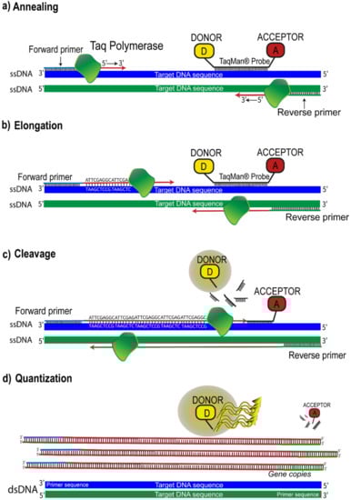However, the most widely employed FRET suppression method remains to increase the separation between DAPs. This mechanism is the basis of well-known techniques such as the famous “Real Time Quantitative Polymerase Chain Reaction” (qRT-PCR), which allows the simultaneous amplification and quantification of specific DNA molecules. In particular, qRT-PCR is the method used in molecular biology for gene expression analysis, genotyping, and routine DNA quantification. Classical PCR allows amplifying in vitro specific sequence DNA by the following steps: (i) denaturation of double-strand DNA (dsDNA) template in single-strands DNA (ssDNA), (ii) annealing, in which two short single-stranded DNA (primers) hybridize by complementary DNA template 5′-P and 3′-OH ends (see Figure 6a), defining the target that will be amplified and, lastly, (iii) elongation, that consists in the polymerization of the new strand carried out by the Taq DNA polymerase enzyme from 5′-P end to 3′-OH end (see Figure 6b). These steps represent a reaction cycle that is repeated until a plateau phase is reached, in which the reaction reagents are exhausted. The qRT-PCR technique combines the classical PCR with FRET, using fluorogenic probes. Thus, the employment of probes allows the correlation of PCR products to changes in fluorescence intensity during each reaction cycle. Although several types of fluorogenic probes have been developed, the most widely used is the so-called “TaqMan”® probe (Thermo Fisher Scientific, Waltham, MA, USA). The TaqMan® probe is an oligonucleotide composed of 20–30 nucleotides, respectively labeled at the 5′-P end with a donor species, the reporter capable of emitting a fluorescent signal, and at the 3′-OH end with an acceptor species, which quenches fluorescence through non-radioactive channels. In this conformation, the two species, which constitute the DAP, are in such close proximity that they can interact and produce FRET. The region of DNA to which the oligonucleotide binds by complementarity is included between PCR primers (forward and reverse in Figure 6). When a new strand polymerization begins, the 5′-3′ exonuclease enzyme activity hydrolyzes the TaqMan® probe, bound to the templates, releasing the fluorophore (donor). This causes the physical separation of the two species (cleavage step in Figure 6c), resulting in the suppression of the FRET mechanism. Meanwhile, as the reaction proceeds, the produced fluorescence is captured and correlated to the amount of target gene copies (see Figure 6d) [45,46,47].