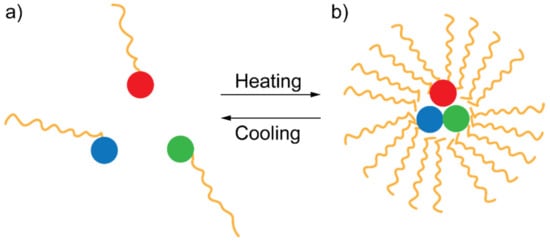Sketch of the heating/cooling mechanism allowing or hindering cascade FRET according to which the FRET triplet switches between two configurations: (a) one in which the components of the FRET triplet are far apart and (b) another in which they are close each other.