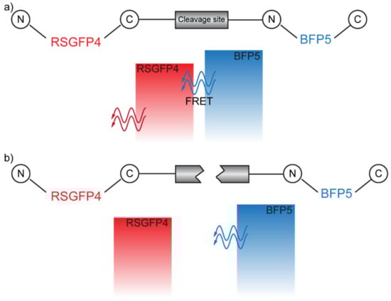 The displacement between the donor and the acceptor pair can also be achieved via enzymatic reactions. This is the working principle that allowed Mitra et al. to detect a Factor Xa, the active form of an enzyme involved in several steps in the blood coagulative cascade, through FRET [43]. In particular, here, the DAP is constituted by two variants of the green fluorescent protein (GFP): (i) RSGFP4, acting as an acceptor, and (ii) BFP5, acting as a donor. The two fluorophores are connected to both sides of a polypeptide containing the cleavage site of Factor Xa, in the absence of which FRET can occur (Figure 8a). When Factor Xa is introduced, it cleaves the site and prevents FRET between the DAP (Figure 8b).