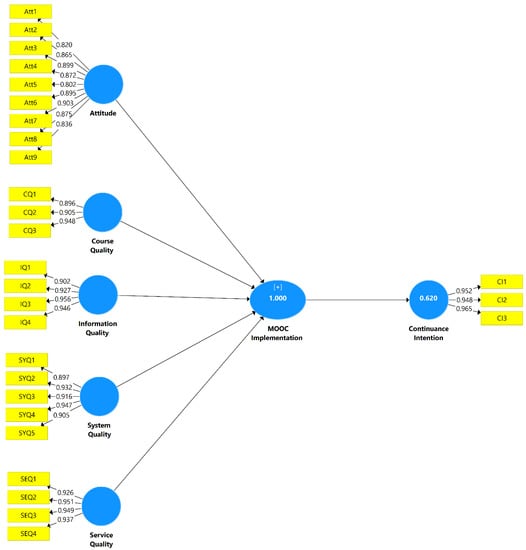 Because the MOOC Adoption construct was a latent second-order construct, the bootstrapping technique was used to determine all latent first-order constructs (i.e., Attitude, Course Quality, Information Quality, Service Quality, and System Quality). On the other hand, the MOOC Implementation concept was formative, and excessive correlations across latent first-order constructs are rarely predicted. Furthermore, the strong correlation among formative items suggests collinearity, which is a concern [68]. As a result, the value of the Variable Inflation Factor was used to investigate the collinearity between the formative latent first-order constructs (VIF). Table 5 reveals that all latent first-order notions have VIF values less than 3.5, indicating that they contribute to MOOC Adoption separately.