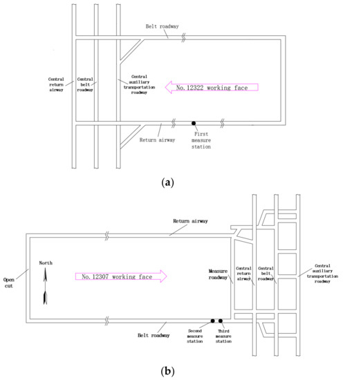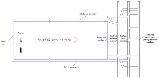 Wangjialing mine, located in Yuncheng, Shanxi Province, is subordinate to China Coal Huajin Group Co., Ltd., with a mine field area of 119.7 km2, industrial reserves of 1.21 billion tons, and recoverable reserves of 777 million tons. The designed production capacity of the mine is 6 million tons per year, and the service life is 92.6 years. The mine field has a simple geological structure and stable coal seam occurrence. The overall structure of the mine field is a monoclinic structure with stratum strike of northeast, dip to west and northwest, accompanied by a wide and gentle anticline fold structure, with numerous and well-developed faults. The No. 12307 working face is located in the west wing of the 123 panel area of Wangjialing Mine. It consists of the 12307 working face belt roadway, the 12307 working face return airway, the 12307 working face open cut, the 12307 working face measure roadway and related bypasses and chambers. Among them, the 12307 return airway is located 11.4 m south of the 12309 belt roadway (the middle of the lane), and the isolation coal pillar is 6.0 m. The 12307 belt roadway is located 307.9 m south of 12307 return airway (centering in the roadway), and the roadway length is 1475.9 m and section size is 5.6 × 3.55 m. The 12307 working face open cut is located at 1425.5 m west of the 2# coal central auxiliary transportation road (the middle of the roadway), and the working face mining length is 1321.4 m. The 12307 working face roadway layout is shown in Figure 1.