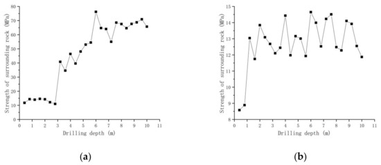 - Whether it is the roof or the two sides, the strength difference and fluctuation of surrounding rock are obvious. Notably, when the hole depth is small, the strength of the surrounding rock will increase drastically. The strength of roof surrounding rock increases from 11 Mpa to 40 MPa, and the strength of roadway-surrounding rock rises from 9 Mpa to 13 Mpa. The obvious difference and fluctuation may be caused by the influence of structural planes such as joints, fissures and weak interlayer, damage to the roadway surface and deep surrounding rock due to excavation, which reduces or loses the strength of surrounding rock, and the different properties between rock strata.