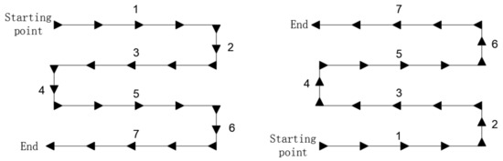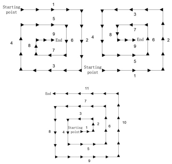 The section of coal roadway is formed by the cutting head of roadheader through the process of point, line and surface cutting. The cutting path of the cutting head of the roadheader has a great impact on the disturbance times of the surrounding rock, the stability of the surrounding rock of the roadway in the empty roof area and the actual efficiency of the roadheader. Research on a reasonable and efficient cutting path is of great significance to improving the tunneling speed of the coal roadway. At present, the common cutting paths are “snake” and “loop” cutting paths, as shown in Figure 5 and Figure 6 below.