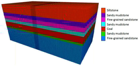 According to the St. Venant principle and combined with the experience of previous construction, the impact area of the roadway excavation is 3~5 times the radius of the roadway [28]. Therefore, the dimensions of the simulation model could be determined: 95 m in the x-axis direction, 50 m in the y-axis direction, and 50 m in the z-axis direction. The simulation is shown in Figure 7. Based on the comprehensive column diagram of the 12307 belt roadway borehole and combined with the results of the geomechanical testing of the surrounding rock, the rock mechanical parameters of the numerical simulation could thus be obtained. The rock mechanics parameters are shown in Table 2. The buried depth of the 12307 belt roadway is 428 m, and the geological stress test results (Serial number 2 in Table 1) are as follows: the vertical stress is 10.28 MPa, the maximum horizontal principal stress is 12.19 MPa, and the minimum horizontal principal stress is 6.22 MPa. The above stress values were applied to the FLAC numerical model as boundary conditions and then calculated to equilibrium to simulate the original rock stress before excavation. The Mohr–Coulomb yielding criterion was used for the numerical simulation.