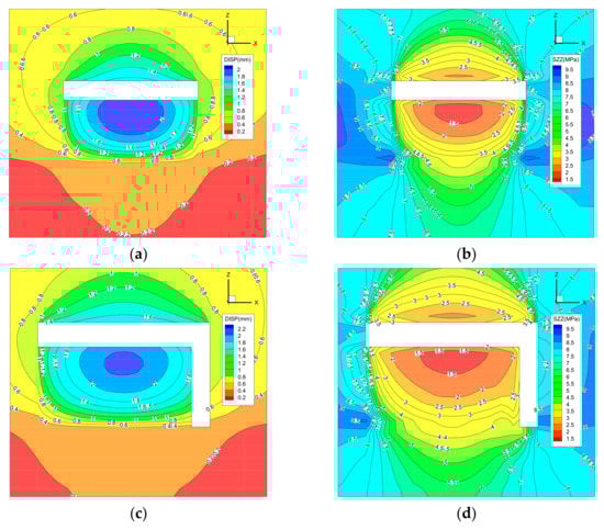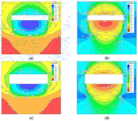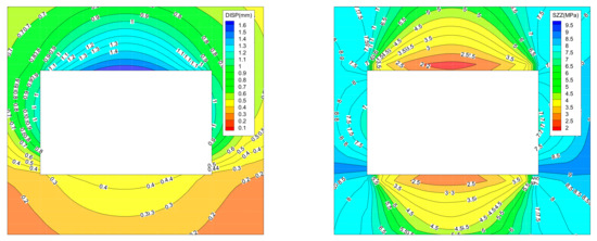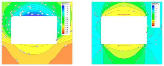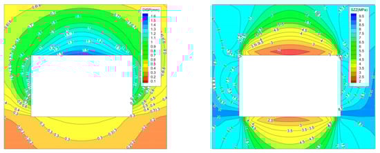 The evolution law of vertical stress and displacement of surrounding rock in the “reverse loop” cutting path is shown in Figure 11 (because the picture occupies too much space and is opposite to the “forward loop” cutting path, the cloud map of stress and displacement distribution of surrounding rock in the first eight cuts is omitted).