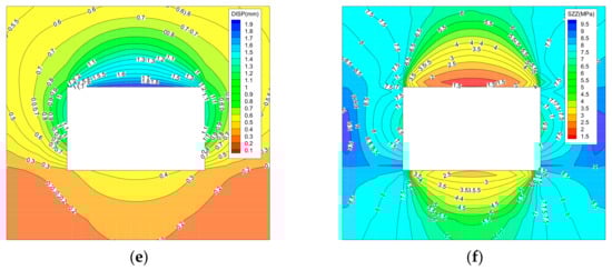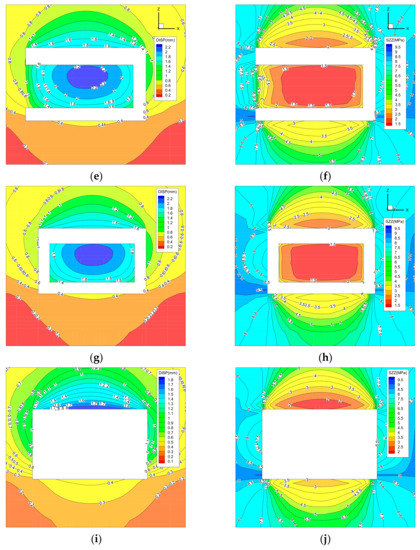 Displacement of “clockwise loop” cutting path (left), stress (right) distribution clouds. (a,b) The first cutting; (c,d) the second cutting; (e,f) the third cutting; (g,h) the fourth cutting; (i,j) the ninth cutting.