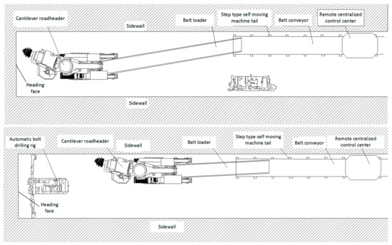 After decades of development, the excavation equipment has perfectly integrated transportation and excavation cutting, which has reached a relatively mature stage. The current supporting equipment and processes for excavating mainly include the matching technology of the cantilever roadheader and the bolt drilling rig, the matching technology of the continuous miner and the bolting trolley, and the matching technology of the integrated drilling and anchoring unit [23,24,25]. Coal loading and transportation are carried out at the same time as excavation and cutting, realizing the parallel operation of excavation and cutting, and transportation.