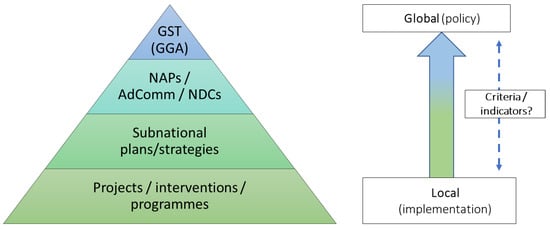 The UNFCCC already recognizes the multiple dimensions where adaptation actions or interventions take place []. Despite this, much of the literature describes adaptation as a “local” issue []. As a result, monitoring and evaluation (M&E) frameworks are mainly developed for use at the local level (e.g., for a community or project/program) []. Likewise, the GST’s evaluation of adaptation progress is based on national assessments, and accordingly most efforts to inform the GST focus on the national level (e.g., [,,,,]). However, adaptation and reporting on adaptation progress also need to be considered as part of broader subnational, national, regional, and global mechanisms, such as the GST [] (see Figure 1). Nevertheless, there are also limits to an aggregated view of adaptation, as not all metrics can be used at all levels [].