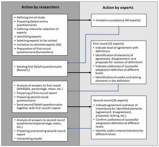 Based on the information presented previously, this section describes the process and steps we followed to implement the Delphi method in our research. Figure 2 summarizes the actions taken by the researchers (left) and the actions taken by the members of the panel of experts (right). The black and blue arrows represent their interactions.