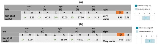 The second questionnaire was prepared based on the answers to the first questionnaire [,]. First, we analyzed the answers (including the frequencies, means and standard deviations, where appropriate). Afterwards, we grouped similar items. In this case, we listed all the elements identified by the experts in each question. Based on that, the experts confirmed their agreement or disagreement with the listed elements. Additionally, they identified the degree of importance for improving the definitions or the usefulness of those elements. Experts could identify more than one aspect that they agreed or disagreed with. Furthermore, each section had an additional field where the experts could share further comments.
