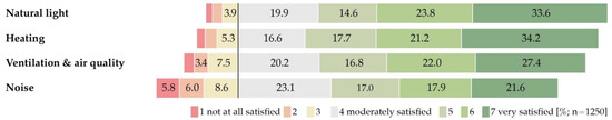 When asked about how comfortable their home is, measured against standard environmental aspects, the great majority was at least moderately and around one third very satisfied with the levels of natural light, heating, ventilation and air quality, and noise (Figure 1). However, 33% (n = 413) of all survey respondents replied further to a contingency question about specific environmental problems they experienced. Among the issues related to natural light (34%) was a lack of or too small windows (7.3%), blocking of light by structures and trees (5.3%), and building orientation (3.6%). Heating was a problem for 41.9% and was largely caused by poor heat distribution and retainment due to inadequate thermal insulation and draught proofing (15.7%) or insufficient and not properly working heating systems (17%). More commonly reported ventilation and air quality issues affecting 35.1% were lacking cross ventilation and operable windows (5.6%) and background or mechanical ventilation (2.9%), leading to damp, mould, and condensation problems (6.8%). In addition, external factors such as air pollution (7.7%) and smells (2.2%) were mentioned by a small number. However, the most common complaint, by almost three-quarters of respondents (74.1%), was about noise. This was especially a problem in flats (48.4%), with complaints split between noisy neighbours (30.3%) and external noise pollution from roads and planes (28.8%).