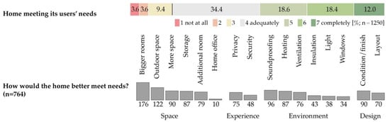 A total of 61.1% (n = 764) of survey respondents listed a wide range of needs and issues that limited the usability of their homes (Figure 2). The greatest number of these replies (46.2%) related to dwelling or property size. Almost a quarter wanted bigger rooms, including more living space (11.4%). Every tenth required at least one additional room, often for use as a toilet, bathroom, or bedroom. Around every twelfth needed a bigger home or generally more space and storage. A small number wanted a separate space for homeworking. Many also mentioned access to any or more open space (16%), particularly gardens and balconies (to flats). Also related to dwelling size was the request for greater privacy (9.8%), which was often associated with perceptions of security (6.3%).