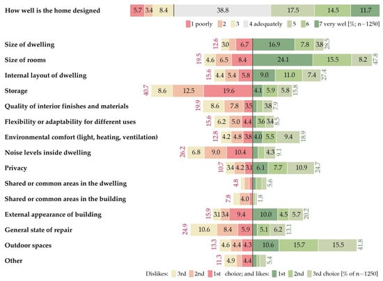 Although only 17.5% of all survey respondents found the design of their home inadequate, many more were unhappy with specific aspects (Figure 3). Questioned about the three things they liked or disliked about their home’s design in order of importance (Figure 3), the five most often mentioned positive features related to room size (28.5%), outdoor space (41.8%), dwelling size (28.5%), internal layout (27.4%), and privacy (24.7%). The five least liked aspects were a lack of storage (40.7%), noise (26.2%), general state of repair (24.9%), quality of interior finishes and materials (19.9%), and the size of rooms (19.5%). Replies are thus inconsistent when compared and point to diverse understandings of housing conditions, expectations, and needs that inform individual responses.