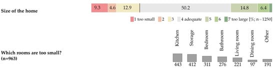 The survey shows that different aspects of dwelling size in relation to individual needs and usability are of great importance to occupants and determine how many assess the design and quality of homes. Alarmingly, a quarter of dwellings were deemed overall too small (26.8%), and over three-quarters (77%) of respondents found at least one room or area lacking in size for their needs (Figure 4). Responding to the contingency question about which rooms are too small (n = 963), the top three answers were kitchens (46%), storage space (42.8%), and bedrooms (32.3%) (Figure 4). However, the pandemic only affected how 14.2% of all respondents felt about the size of their homes. Of these (n = 178), 68.5% lived in a flat—which two-thirds rented (65.6%)—with 92.6% having changed how they used their home during the pandemic, 80.3% considering moving, and, importantly, 72.9% stating that the size or quality of their home had affected their wellbeing during COVID-19.
