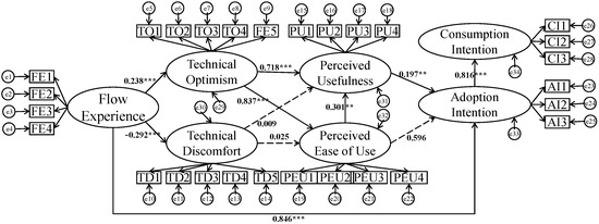 Consumer flow experiences can affect the acceptance of virtual tourism technology through the readiness for virtual tourism technology, thereby affecting intentions to use virtual tourism technology. First, the flow experiences of consumers significantly affect their perceptions of virtual tourism technology. Specifically, the flow experiences of consumers will stimulate their inner positive emotions, which can significantly improve their recognition of and optimism toward virtual tourism, so consumers can have higher expectations for virtual tourism technology. At the same time, positive flow experiences can eliminate consumers’ unfamiliarity with virtual tourism technology, reduce their concerns, enhance their confidence, and reduce their discomfort with virtual tourism technology, as people often have an instinctive psychology of avoidance in the face of a new, strange concept. Flow experiences in virtual tourism can improve the cognitive level of consumers to a certain extent and can reduce the technology discomfort caused by unfamiliarity. Second, virtual tourism technology readiness, especially optimism, has a significant positive impact on consumer technology acceptance. This is consistent with existing research conclusions [64]. The flow experience makes consumers behave more intuitively when evaluating the quality of virtual tourism technology. A positive experience will make consumers more optimistic. Evaluations of this form of tourism tend to be positive and hopeful. It is believed that it not only has a low threshold for use, but it can also bring more interesting tourism experiences and higher utility levels. Therefore, a sound sense of experience will make consumers more optimistic about virtual tourism technology, thereby affecting perceived ease of use and usefulness. At the same time, it is worth noting that another factor of technology readiness, technology discomfort (a negative emotion), has no significant inherent influence on technology acceptance (including perceived ease of use and usefulness). As Parasuraman pointed out, although positive and negative emotions exist at the same time and interact with each other in the individual, one must be dominant, and dominant emotions vary from person to person [41]. This shows that, for most consumers, discomfort with virtual tourism technology is relatively weak or that the intensity of this discomfort is still within the allowable range, meaning that it will not have a significant impact on the process of technology adoption.