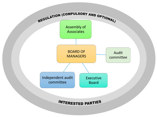 Governance is the “system by which companies are run, monitored and encouraged, involving the relationships between partners, the board of managers, the board of directors, supervisory and control bodies and other interested parties” [46] (p. 20). It should be noted that the legal institution of a private non-profit entity occurs through an association or foundation. This research was carried out in an association qualified by the Ministry of Justice as a social organization (SO). For Gomes [47] (p. 39), the qualification as SO is the process in which the public administration “grants a title to a private, non-profit entity, so that it can receive certain benefits from the Government (budget allocations, tax exemptions, etc.), to accomplish its purposes, which must necessarily be of interest to the community”. The governance structure of an association is usually composed of an assembly of associates, a board of managers, an audit committee, an executive board and an independent audit committee [46] (p. 19), as illustrated in Figure 1 below.