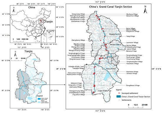 China’s Grand Canal Tianjin Section spans an area of up to 182.6 km, and the core surveillance area grosses 670 km2 (hereinafter referred to as “Tianjin Section”). The fork estuary of the northern and southern parts of the Canal covering 71 km is the section of world cultural heritage, comprising 16 township settlements and up to 380 village settlements. However, the cultural heritage area consists of merely one famous state-level historical and cultural town, one city-level historical and cultural town, one city-level historical and cultural village and 28 canal heritage sites of various kinds, highlighting the severe situation of canal settlement conservation. The selection of the typical rural settlement space of China’s Grand Canal Tianjin Section was based on diversity and balance to ensure the typicality and representativeness of the research cases. By referring to the history of the Canal and a variety of county annals, we performed a field investigation of 44 typical canal settlements (Figure 1).