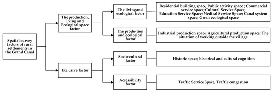 The investigated factors influencing the settlement space environment along the Grand Canal were mainly determined by the factors of life and ecology of production as well as exclusive factors. On the one hand, judged from the connotation and spatial scope of life and ecology of production, the spatial scope of the land for life and ecology of production was composite [36]. For instance, the space for ecological greening and the canal river system are important for daily life and entertainment as the carriers of the ecological space. Agricultural production space such as cultivated land, forest and garden plots had similarly important ecological functions; therefore, the settlement space environment along China’s Grand Canal could be divided into ecological factors for life and ecological factors for production. On the other hand, the factor of social culture and that of accessibility could be taken as the exclusive factors of investigation into the rural settlements along the Canal. The exclusive characteristics of the settlement space environment along the Canal were flowing canal heritage. Hence, cognition investigation into the historical heritage and the history and culture of China’s Grand Canal was prioritized, emphasized the significance of the investigation and was good for the understanding of the cultural connotation and social evaluation of the rural settlement space along the Canal. Some scholars held the view that the space for life and ecology of production could not cover all types of land use and proposed the division of “space for life, ecology of production + guarantee space” and “space for life, ecology of production + regional facility space” [37,38,39]. Therefore, we took the space for transportation service with protective functions as the factor of accessibility to supplement the investigation of exclusive factors.