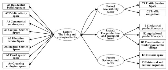 For the ecological Factor 1 of life, the standardized load factor coefficients of the observational variables were A8 > A4 > A5 > A3 > A1 > A2 > A8 > A6, from top to bottom. The measurement result shows (Table 10) that (1) the residents attached more importance to evaluating the canal river system. According to the investigation and interview, China’s Grand Canal was the mother river between the space of settlements on both banks, nourishing the ancestors for generations. With the vicissitudes in China’s Grand Canal, the residents had more expectations for the transforming and upgrading of the Canal. Moreover, (2) the standardized load coefficients of the space for cultural services, educational services, commercial services, residential buildings and public activities were balanced, indicating that the comprehensive perception of the residents for the factors of ecology of life in the rural settlements along China’s Grand Canal focused on the improvement of cultural, education and commercial facilities as well as residential buildings and space for public activities.