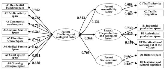 Moreover, the standardized path coefficient indicates that Factor 4 (the factor of social culture) exerts the greatest influence on Factor 1 (the factor of ecology of life), followed by the influence of Factor 1 (life) on Factor 3 (the factor of accessibility), then that of Factor 1 (life) on Factor 2 (the factor of ecology of production), and finally, that of Factor 3 (accessibility) on Factor 1 (life).