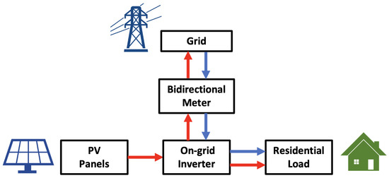 Schematic diagram of a PV system interconnected to the grid. Flows in red correspond to local generation, while flows in blue correspond to energy coming from the grid.
