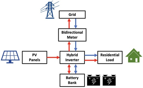 Schematic diagram of a PV system with BESS to support residential load and EV charging. Flows in red correspond to local generation, while flows in blue correspond to energy coming from the grid.