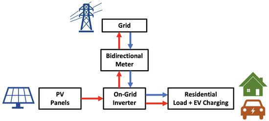Schematic diagram of a PV system without BESS to support residential load and EV charging. Flows in red correspond to local generation, while flows in blue correspond to energy coming from the grid.