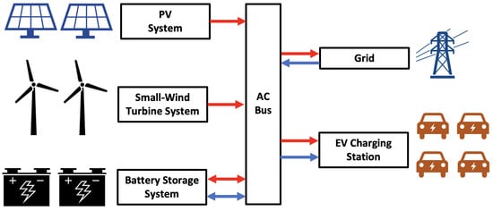 Schematic diagram of a hybrid PV-wind system with BESS to support EV charging station. Flows in red correspond to local generation, while flows in blue correspond to energy coming from the grid.
