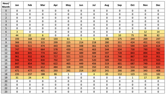 where is the theoretical energy generated by the PV panel at a given time of day (Wh) and is the time interval of 1 h in which the corresponding incident global radiation level exists. In this way, the daily theoretical energy generated by each PV panel is given below (see Equation (3)) [26].