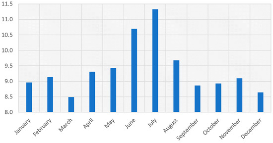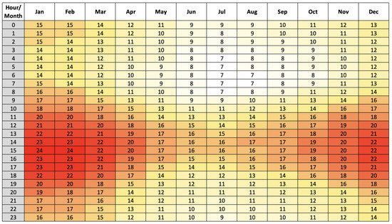 The home of this case study is located in the city of Viña del Mar, Chile. The latitude, longitude and height above sea level correspond to 33.03° South, 71.32° West and 16 m above sea level, respectively. The meteorological data were obtained from the Solar Explorer online platform that allows analyzing the renewable resources available within the geography of Chile [23]. Based on the data obtained, Figure 8 shows the average levels of the global hourly radiation incident on the inclined plane with an angle of inclination equivalent to the latitude of the place for each month of the year. Additionally, it can be seen that the most critical months with lower global radiation correspond to June and July. Figure 9 shows the average values obtained of the hourly ambient temperature for each month of the year.