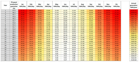 In this way, a loss factor of 0.698 is obtained, with the values assumed in Table 6 [29]. Then, effective energy generated by each PV panel can be calculated Equation (9) as given below [28,29]: