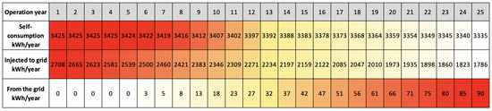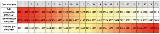 Regarding the simulation results, the projected generation is obtained for 25 years of operation in each case. Figure 14 shows the PV system with BESS, where the PV system generates 6.8 MWh per year, in which 45% per year is self-consumed at home, 39% is injected into the grid and 16% corresponds to energy losses. On the other hand, the home’s energy consumption is 3.4 MWh per year, in which only 11.5% is supplied from the grid, thanks to the implementation of the BESS. It can also be seen that during the months of April and June, a significant amount of energy can be seen from the grid together with energy injected into it, so in these cases the capacity of the BESS was not sufficient to store all the surpluses and be used as self-consumption later. A similar case occurs during May and July, where there is energy to and from the grid. However, in this case, even if all the surpluses were stored, energy would still be present from the grid since the latter is higher than the injected one.