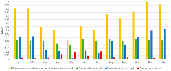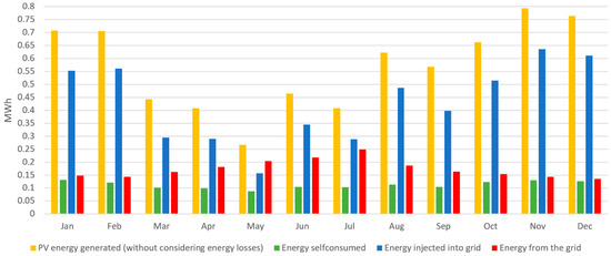 Figure 15 shows the PV system without BESS. There is the same PV generation as in the previous case of which only 19.6% per year is self-consumed at home, 75.4% is injected into the grid, and 5% corresponds to energy losses. This is a lower percentage than the previous case since losses at the level of the BESS are avoided. On the other hand, this is the same energy consumption of the home of which 61% per year is supplied from the grid, and where in the winter months the highest values are seen.