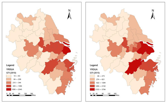 Spatial–temporal differentiation diagram of green technology innovation in the Yangtze River Delta urban agglomeration (2010, 2015 and 2019).