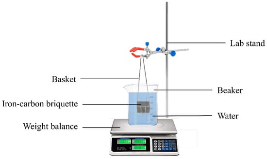 The apparent densities of the briquettes were measured using a setup shown in Figure 1. Firstly, the weight of each briquette was measured with a weight balance. Secondly, the volume of the briquette was determined by fully submerging a briquette in a beaker containing water. The briquette had been placed in an iron wire basket that was attached to a lab stand to avoid the briquette sinking to the bottom of the beaker. The volume of the briquette was calculated by dividing the weight difference before and after submerging the briquette in water by the density of water at 25 °C. The briquette had been wrapped in a thin layer of plastic film prior to immersion in water to prevent penetration of water into the briquettes’ pores. The volume of the basket and plastic film was assumed negligible. The volume of each briquette was measured 5 times to obtain an average value. The apparent density of the briquette was then calculated by dividing the weight of the briquette by its averaged volume.
