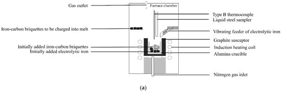 Experimental details of melt carburization experiments with iron–carbon briquettes: (a) schematic illustration of experimental setup; (b) schematic illustration of experimental procedure.